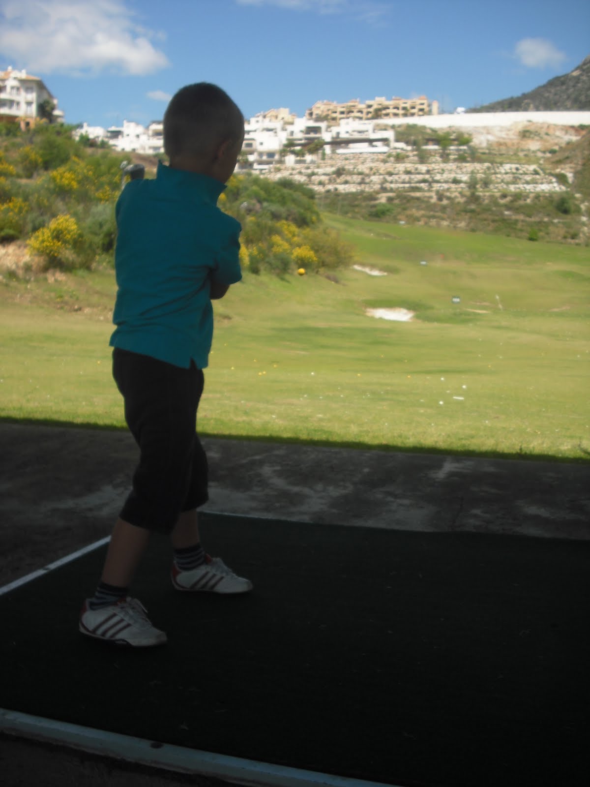 I had always thought its kinda boring and I will never have nerves for golfing.. I had only tried few times before today. Our friend took us to a nearby small golcourse and a practise range in Benalmadena. At Benalmadena Golf they have a small 9-hole course, all of them Par 3 and a nice practise range. Just perfect for a starter! And close enough since I had kids with me. We have only been playing Golf with Wii before with Oskar. Patrik has been playing some golf for years and have had his Golfbag for long time. So basically, all these months we have had 2 bags, un-used!